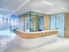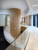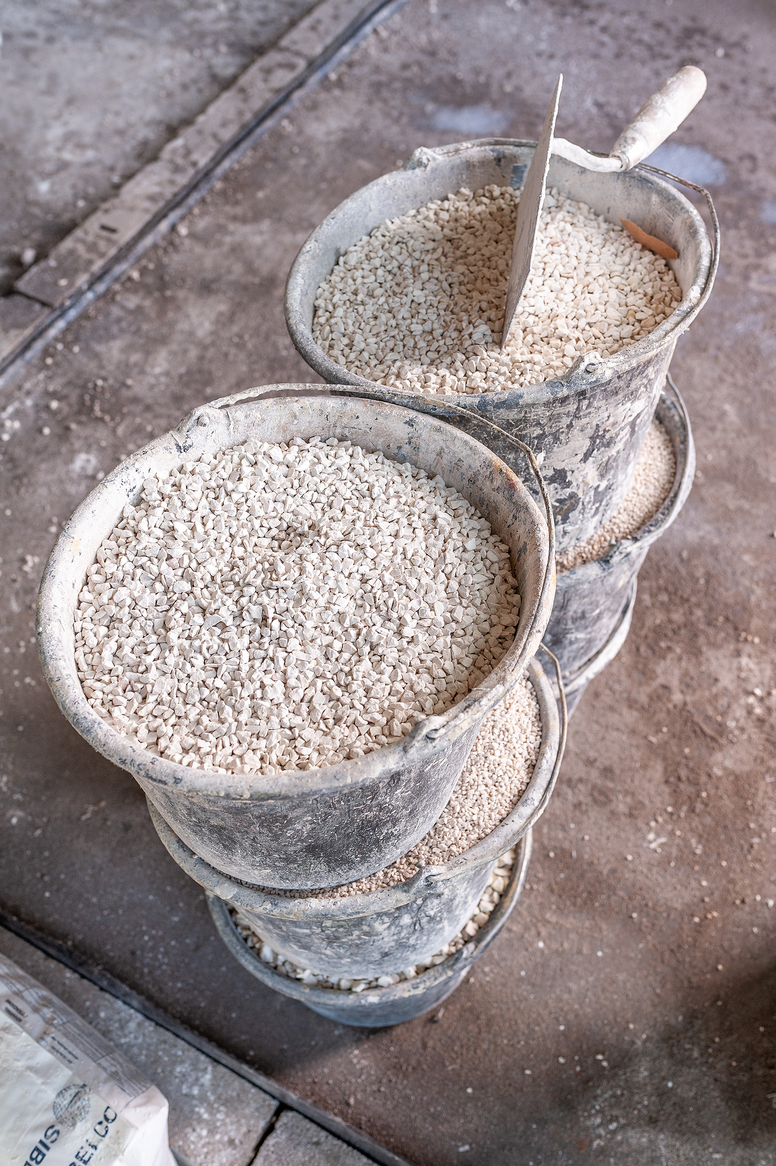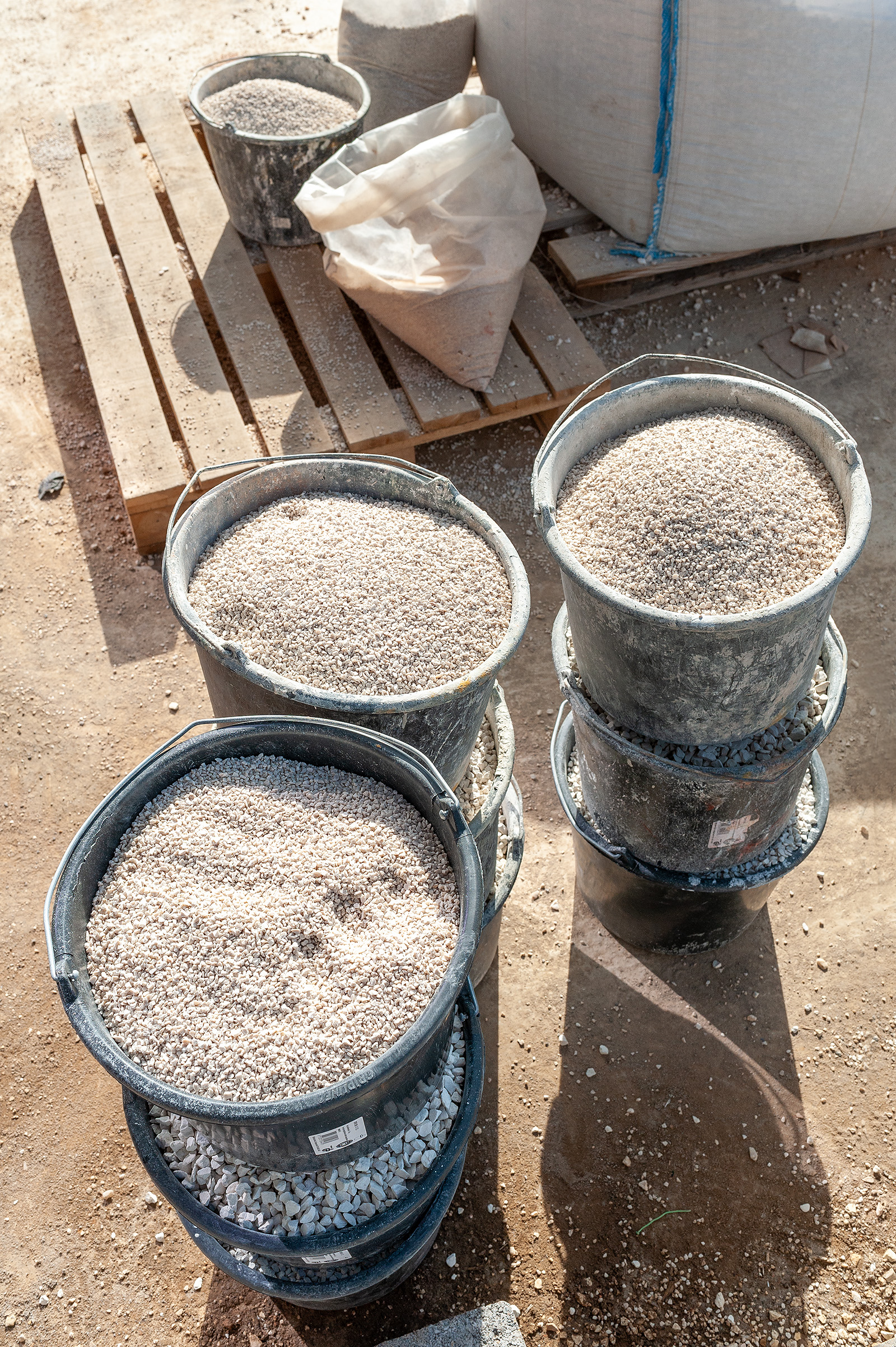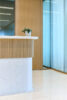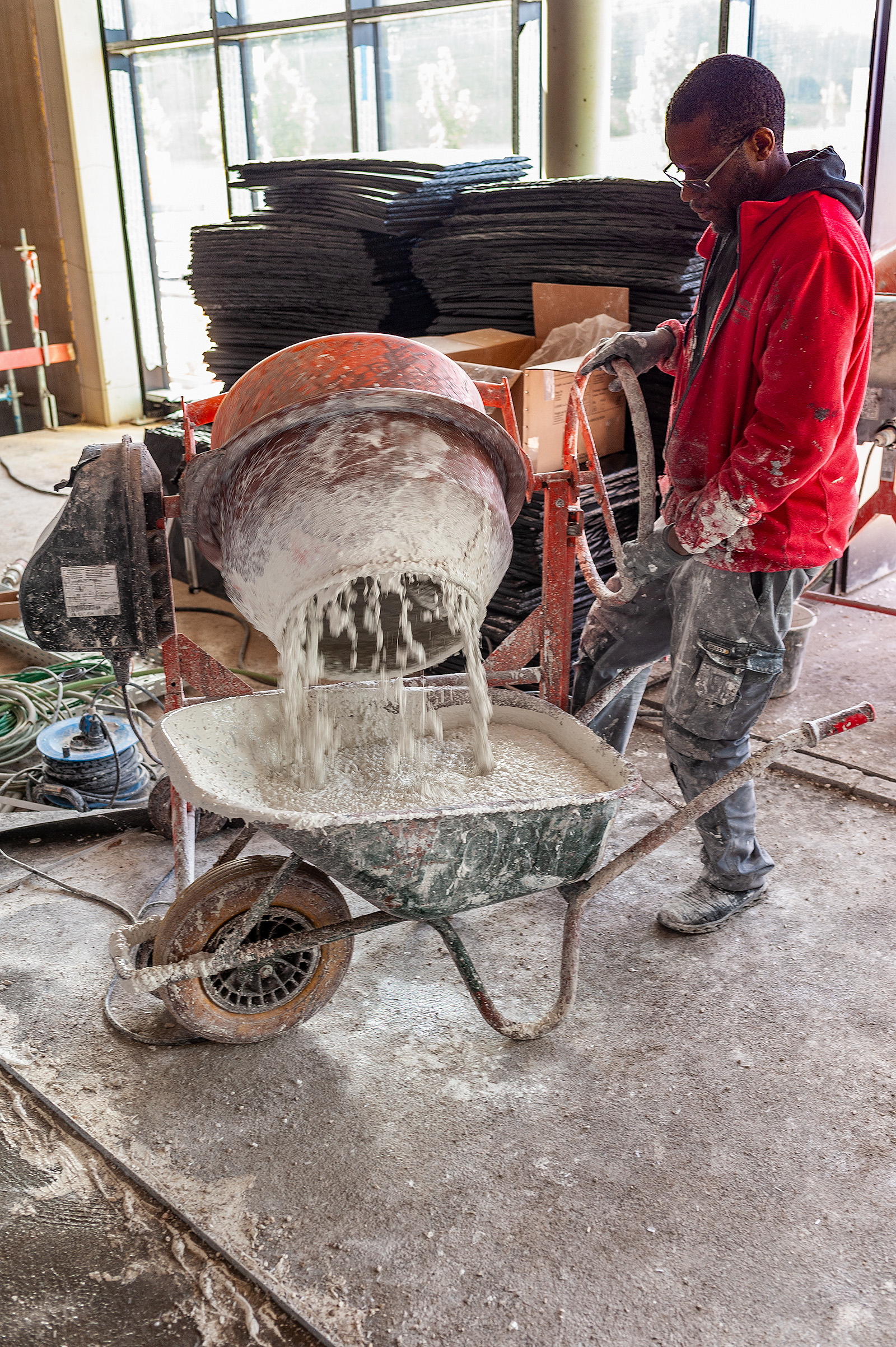 Les travaux de granito, menés au dernier trimestre de 2023 en vue de l’inauguration prévue en 2024, se sont déroulés sur une période de 12 semaines. Cette phase incluait la livraison de 18 tonnes de concassés de marbre et ciment, suivie des étapes minutieuses de coulage, de polissage et de finitions. Le granito clair et lumineux du rez-de-chaussée s’associe harmonieusement avec le bois du desk d’accueil, fabriqué sur mesure, créant une atmosphère élégante et accueillante dès l’entrée du bâtiment.