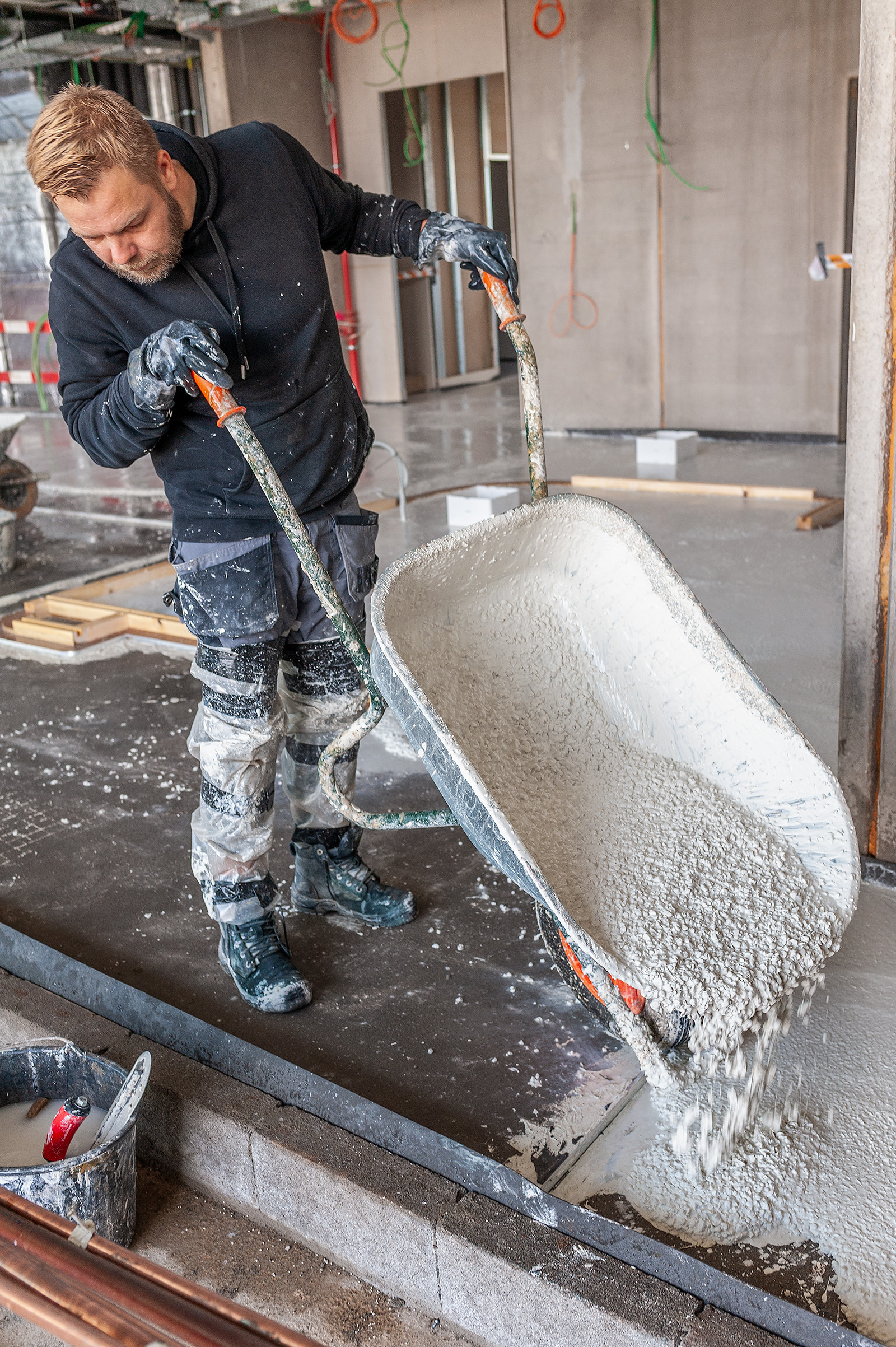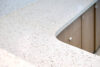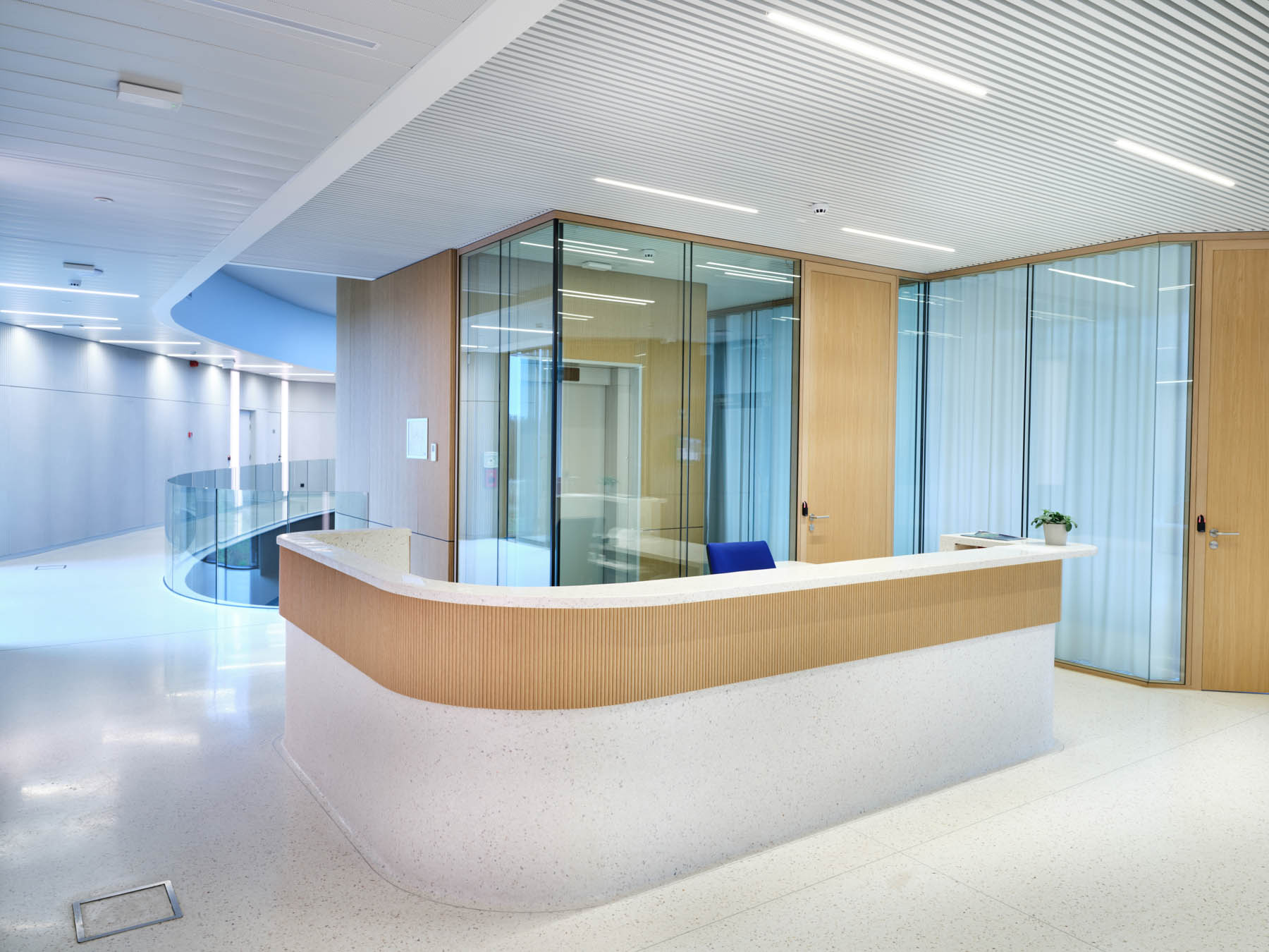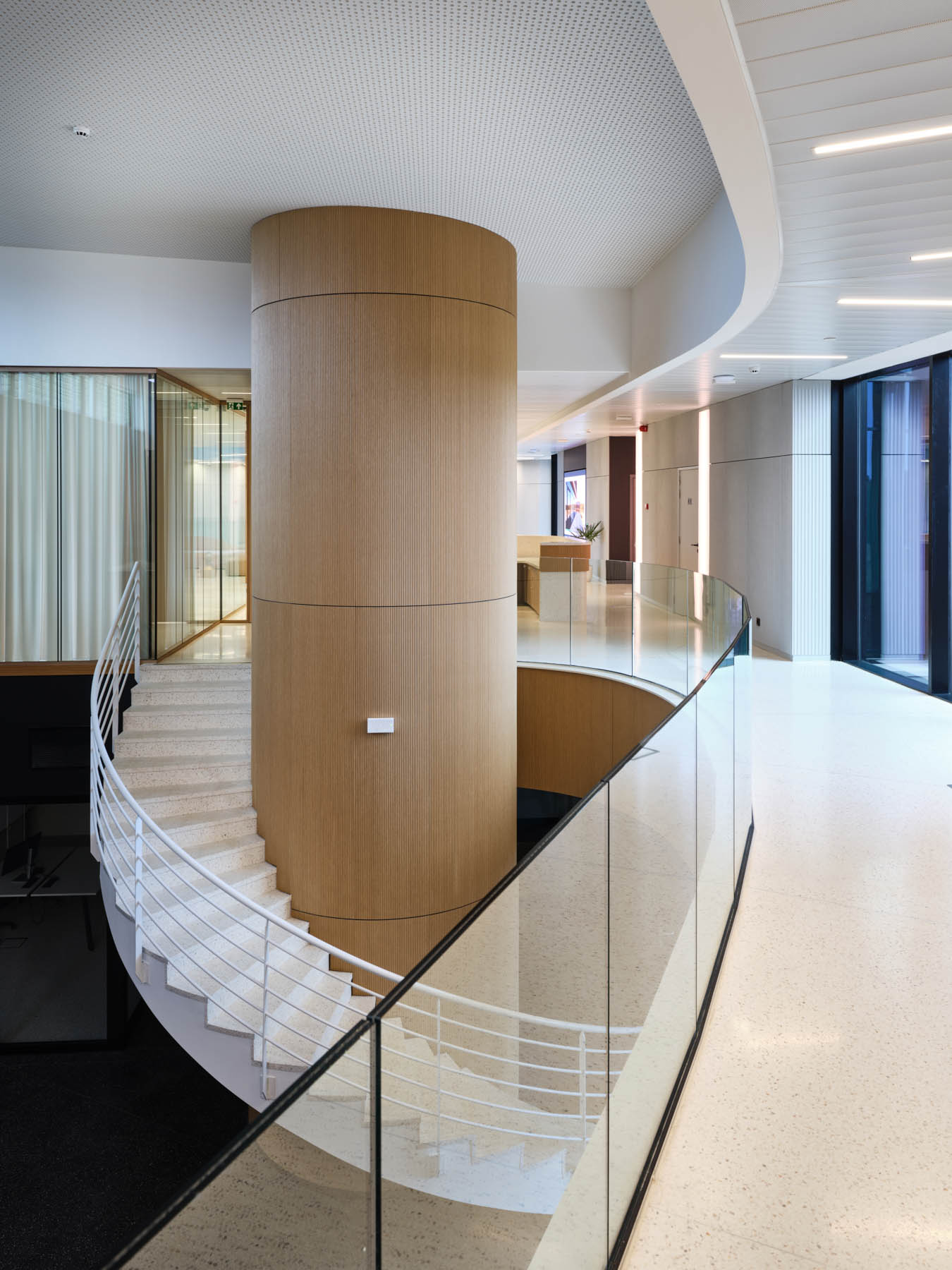 Pour ce centre d’excellence, le cabinet d’architecture Assar a conçu un bâtiment modulaire de 3 300 m², réalisé par l’entreprise générale Wust, qui a coordonné l’ensemble des travaux. Notre mission a été de réaliser les sols de l’entrée, le desk d’accueil, l’escalier menant au sous-sol, ainsi que le sous-sol lui-même. Dès le début du projet, nous avons établi une collaboration fructueuse avec l’architecte et le maître d’ouvrage. Des échanges riches et constructifs nous ont permis de développer six échantillons différents pour atteindre le parfait équilibre dans les teintes et les granulats de granito. L’utilisation de marbre blanc de Vérone a joué un rôle clé, apportant une légèreté visuelle au granito clair.