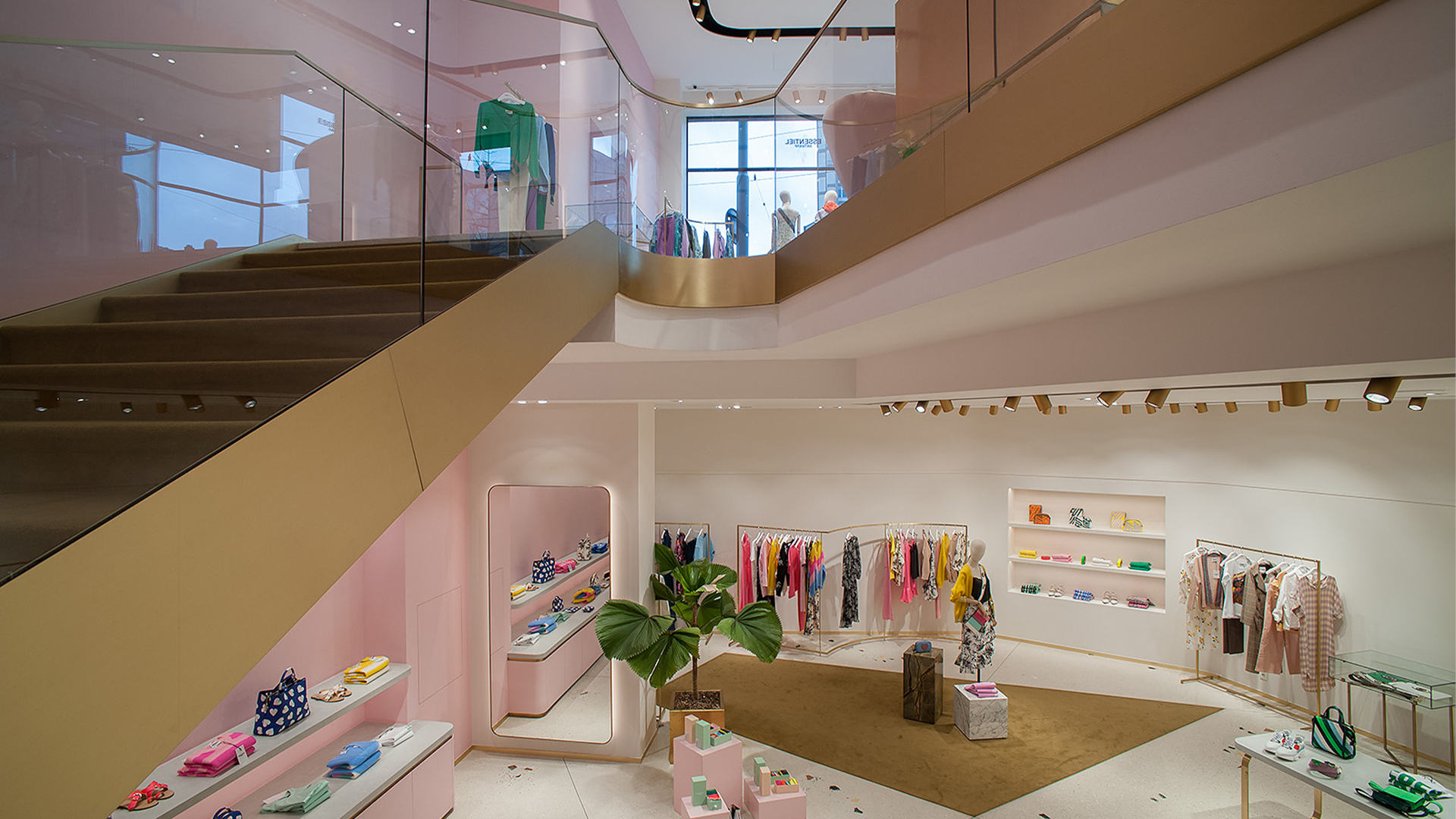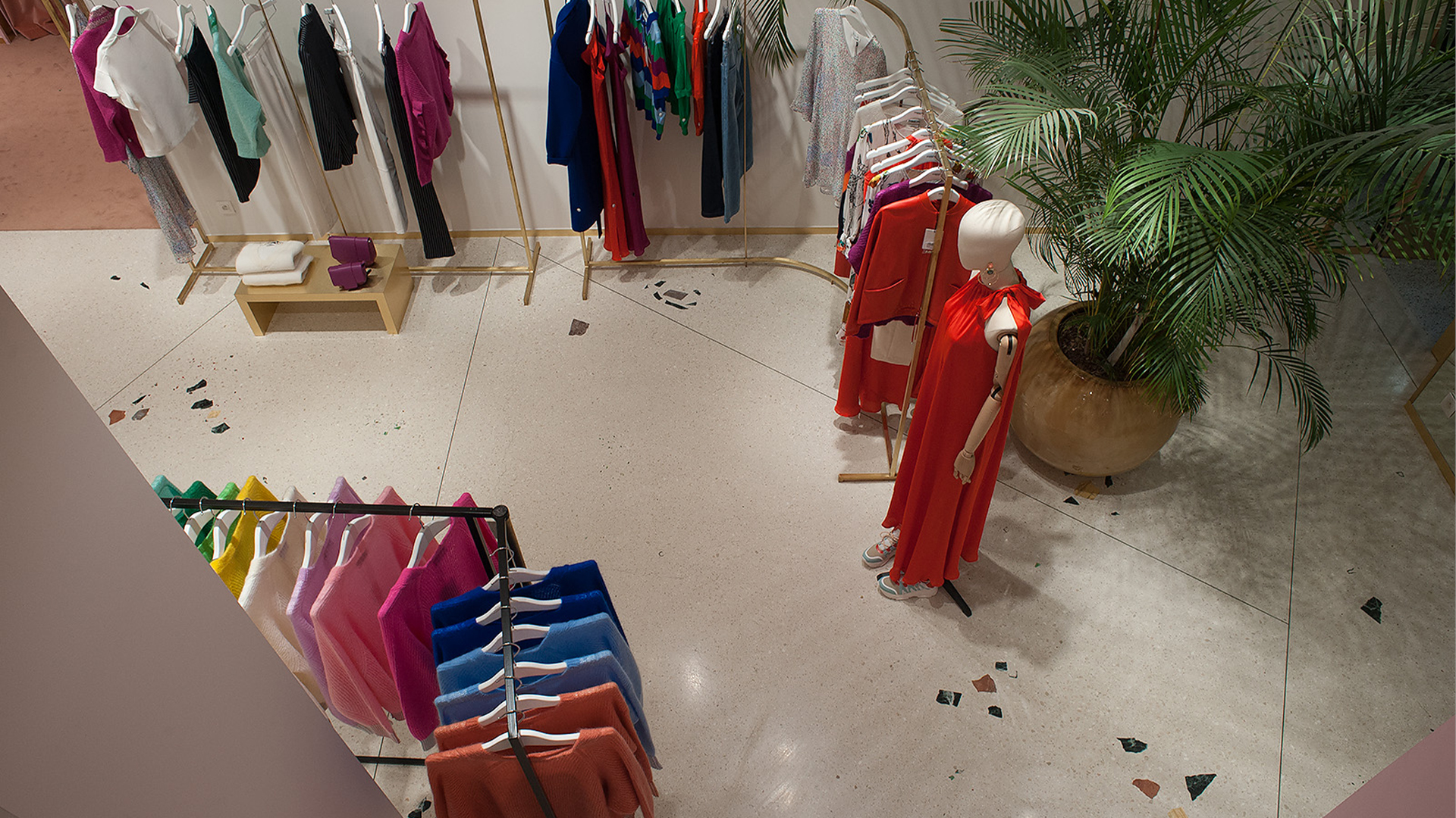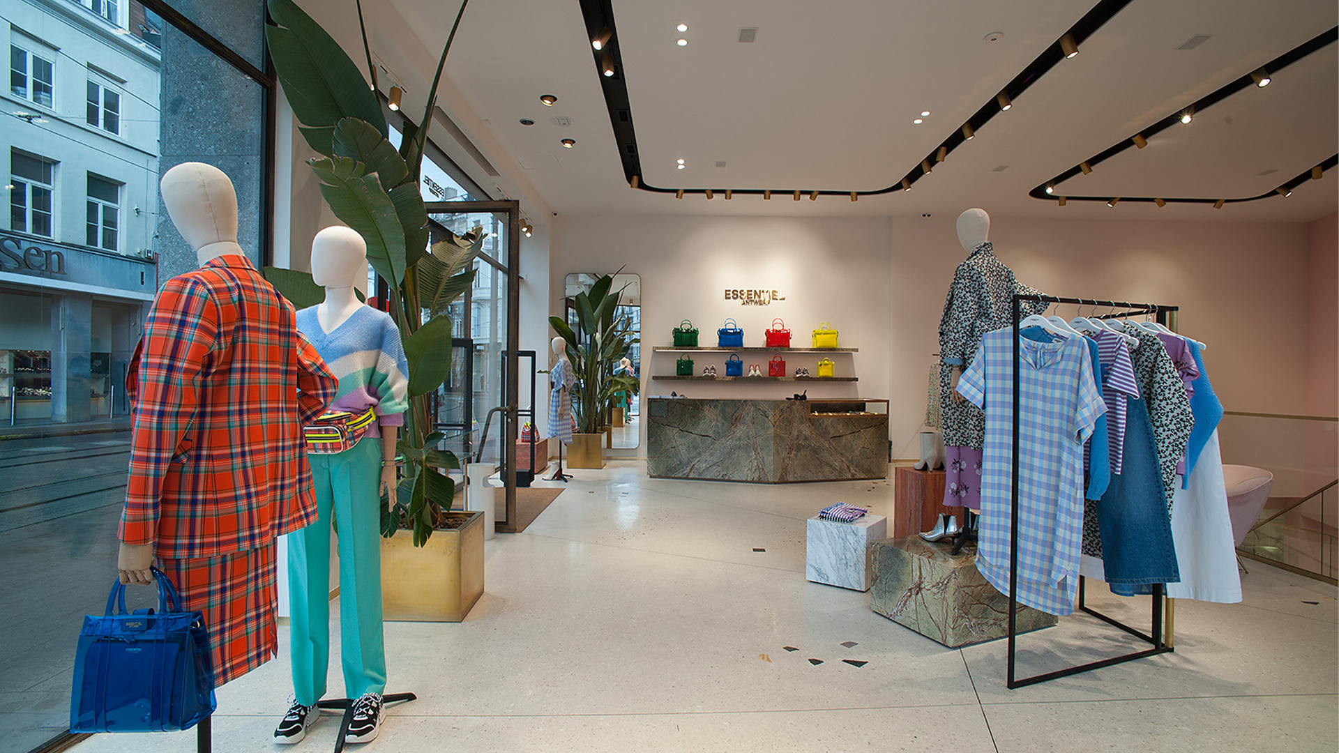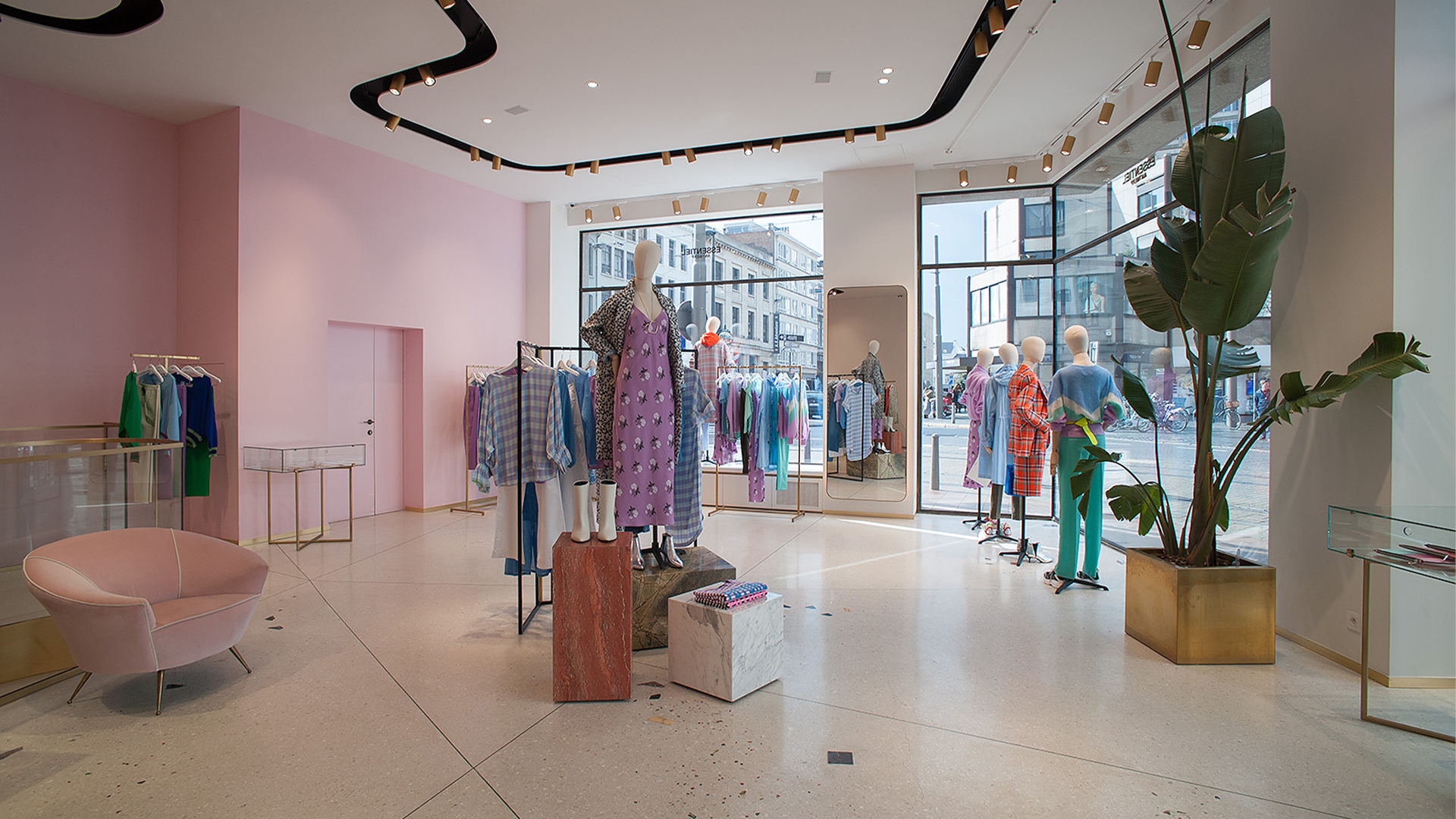 Pour son enseigne à Anvers, le magasin Essentiel voulait quelque chose de différent et jouer avec les formes géométriques, le laiton et des cassons de marbre de couleurs pour contraster avec le granito beige. Le résultat est sublime et affirme une réelle personnalité.