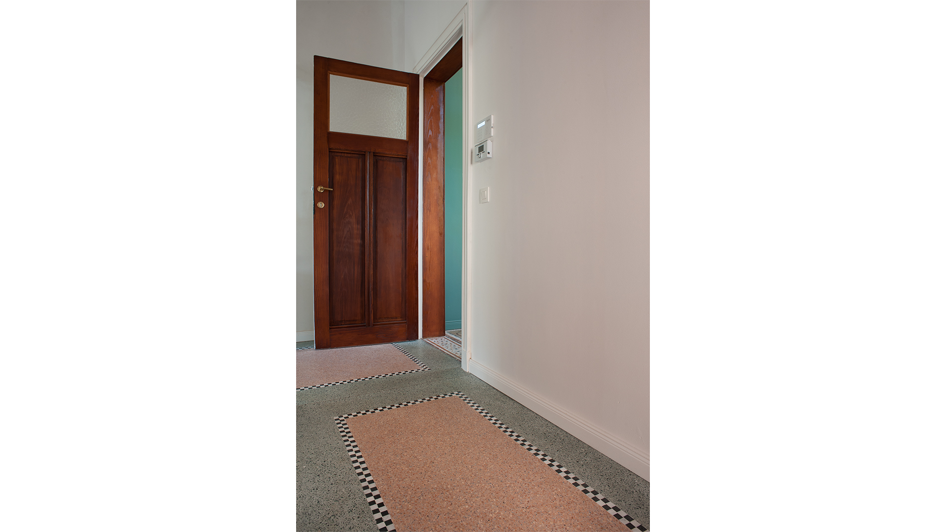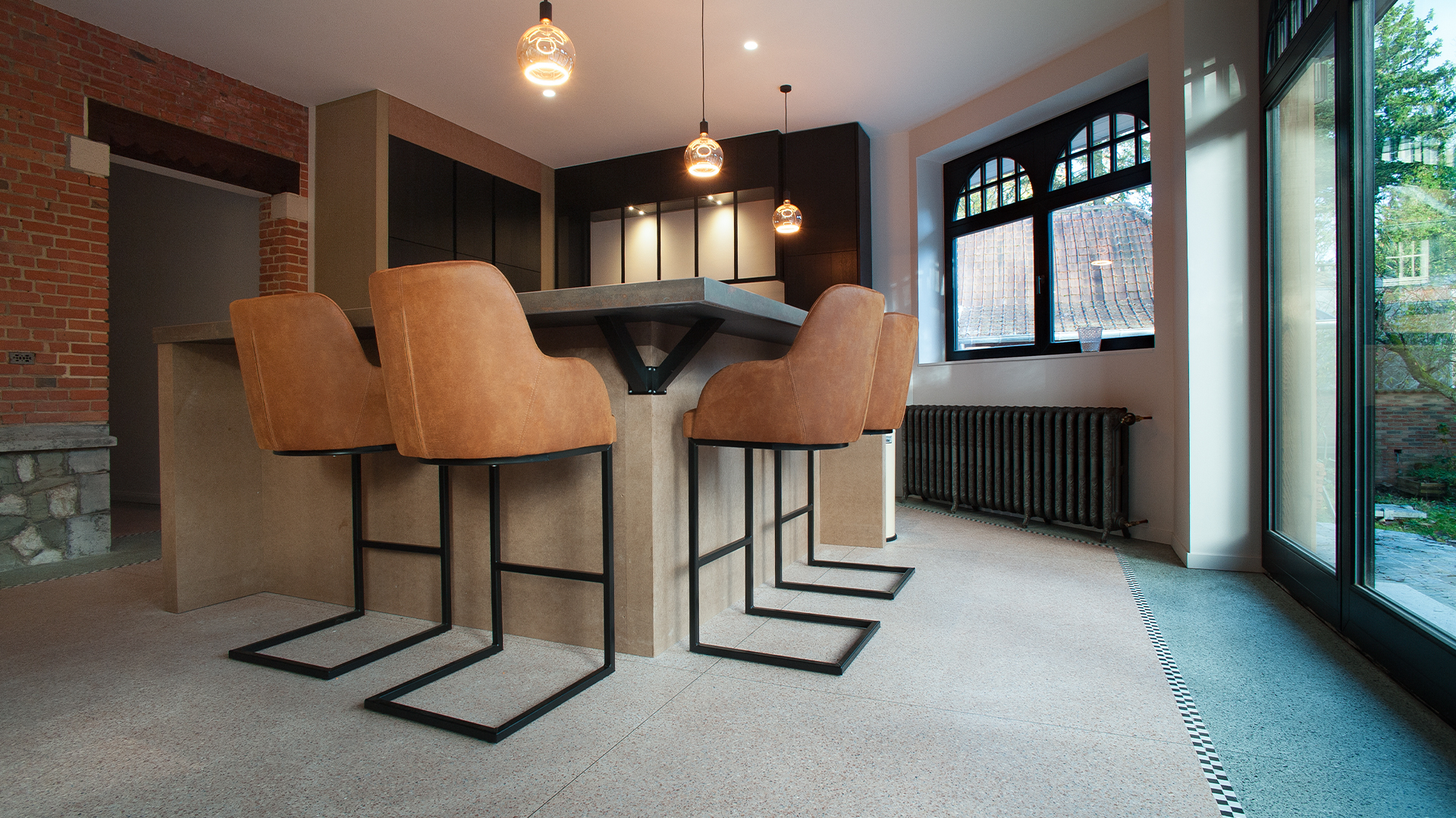 Les propriétaires de cette belle maison unifamiliale à Tervuren nous ont contactés pour la restauration d’une partie de la mosaïque et le coulage d’un nouveau granito en deux teintes. Un liseré de mosaïque en damier crée un équilibre entre l’ancien et le nouveau.